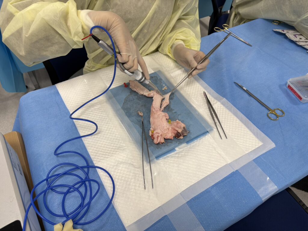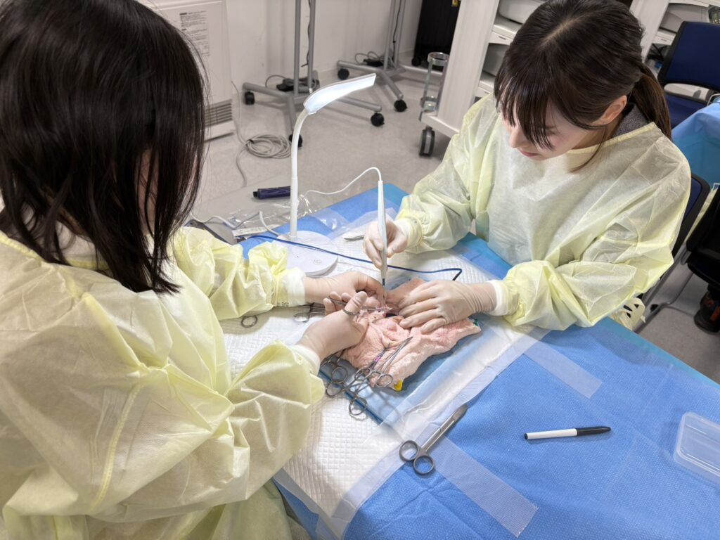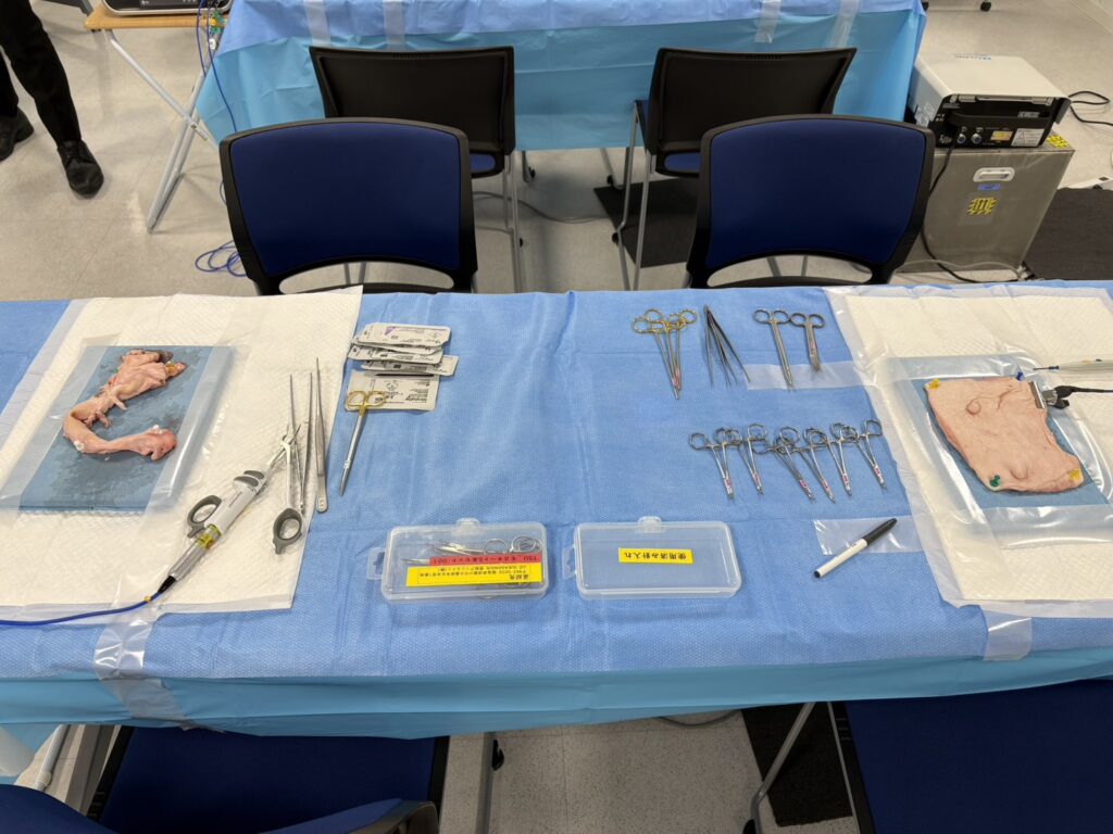 次世代へ繋ぐ乳腺外科手術手技:若手医師主導のハンズオンセミナー実施しました ブタの標本を用いて、乳房切除術と腋窩郭清のシュミレーションです 若手の先生が真剣に行っています このような鍛錬が本番に活きてきますね ハンズオン後の懇親会